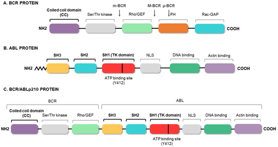 BCR/ABL protein domains. Protein regions located in the BCR (A) and ABL (B) proteins, and those maintained in the fusion (C). The figure highlights the coiled-coil (CC) domain of BCR, which allows the dimerization of the oncoprotein, and the three SRC domains of ABL1, including the tyrosine kinase domain (SH1) and the regulatory domains (SH2 and SH3).