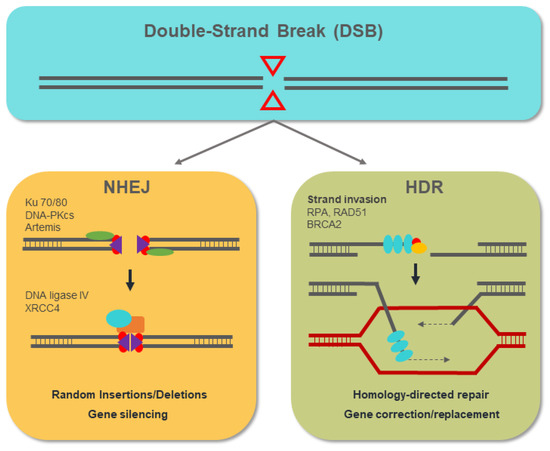The non-homologous end-joining (NHEJ) mechanism involves the action of the proteins ku70/80, DNA-PKcs, and Artemis, with the ability to bind to the free DNA ends that are generated. The resected DNA ends are joined by the action of ligase IV with the insertion of a variable number of nucleotides (indels) that, in most cases, lead to the generation of null alleles. The homology-directed repair (HDR) pathway begins with the resection of the released DNA ends. The RPA, Rad51, and BRCA2 proteins act by binding and protecting the ssDNA that is generated. Through homologous recombination, the HDR pathway allows the introduction of DNA templates from exogenous donors at the double-strand break (DSB) site, replacing the target genomic sequence.