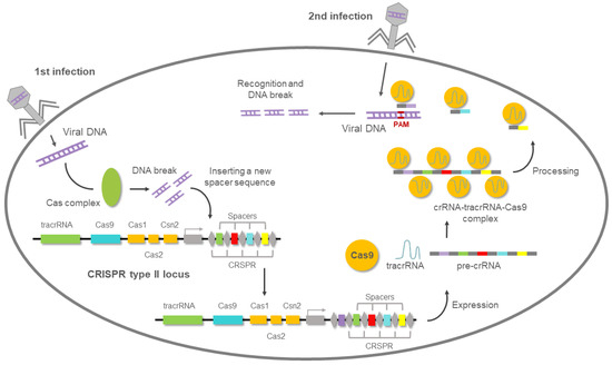 Most of archaea and almost 50% of bacteria have an adaptive immune system to defend them against phage infection. This system is defined by a genomic locus with a series of short palindromic repeats separated by unique “spacers”, preceded by an AT-rich “leader” sequence and forming a cluster [55]. Francisco Mojica was the first researcher in 1993 to describe this matrix of tandem-repeated sequences working on the archaea Haloferax mediterranei [56]. Previously, a similar structure was described in Escherichia coli and he also spotted a connection with eubacteria [57]. Mojica coined the acronym of CRISPR (clustered regularly interspaced short palindromic repeats) in accordance with Ruud Jansen, who first used the term in print in 2002 [58]. Three years later, it was reported that these unknown spacer sequences had a high percentage of similarity with sequences found in various types of bacteriophages and plasmids and it may represent a immunological memory [59,60,61].
