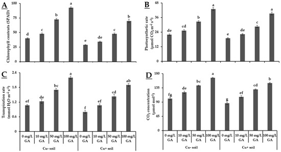 Effect of GA3 application on physiological variables of pea grown in Cu+ and Cu− soil. (A) Chlorophyll contents; (B) Photosynthetic rate; (C) Transpiration rate; (D) CO2 concentration. Different letters indicate significant difference among treatment means according to Tukey’s honestly significant difference (HSD) test (p ≤ 0.05). Vertical bars indicate mean ± standard error (n = 4, 5 plants per replicate under bi-factorial CRD arrangement).