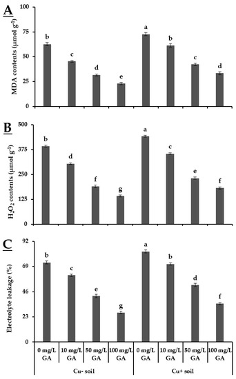 Plants grown in Cu− soil, when treated with 100 mg·L−1 GA3, showed minimum MDA and H2O2 contents and electrolyte leakage (23 µmol·g−1, 143.32 µmol·g−1, and 27.2%, respectively). The plants grown in Cu+ soil exhibited increased electrolyte leakage, MDA, and H2O2 contents than those were grown in Cu− soil. The exogenous application of GA3 significantly reduced electrolyte leakage, MDA, and H2O2 contents in a concentration-dependent manner. The maximum decrease in MDA, H2O2, and electrolyte leakage were observed in plants treated with 100 mg·L−1 GA3 in Cu− (63.29%, 63.40%, and 62.84%, respectively) and Cu+ soils (54.12%, 58.79%, and 57.66%, respectively) as compared to other experimental units and control (Figure 2).