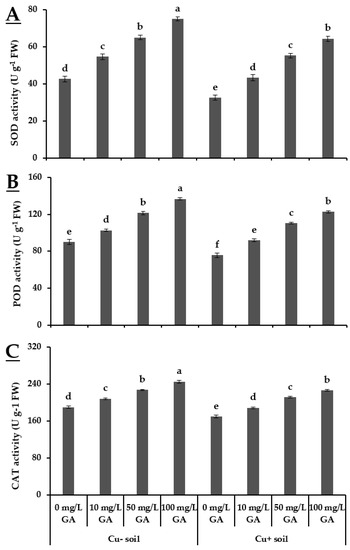 The exogenous application of 100 mg·L−1 GA3 exhibited maximum SOD activity in the plants grown in Cu− soil (75 U·g−1·FW) followed by the plants grown in Cu+ soil (64.39 U·g−1·FW). In similarity with the aforementioned variable, the highest POD activity (136.21 U·g−1·FW) was also observed in pea plants grown in Cu− soil treated with 100 mg·L−1 GA3. Plants receiving foliar application of 50 mg·L−1 GA3 also showed better performance in both soil conditions. In the case of CAT activity, maximum value (245 U·g−1·FW) was also recorded in plants treated with 100 mg·L−1 GA3 in Cu− soil. The reduced activity of antioxidants i.e., SOD, POD, and CAT in untreated plants grown in Cu+ soil indicates a significant effect of Cu stress on pea plants (Figure 3).