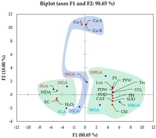 Principal component analysis (biplot) among observations (treatments) and variables (morphological, physiological, and oxidative attributes) of peas. Blue and red colored text depicts GA3 treatments on plants grown in Cu− and Cu+, respectively. Clustering of observations and variables into groups (colored shading) is based on their highest squared cosine values corresponding to the factor, F1 (green) and F2 (blue). Abbreviations: 0GA—no GA3 treatment; 10GA—10 mg·L−1 GA3; 50GA—50 mg·L−1 GA3; 100GA—100 mg·L−1 GA3; PH—Plant Height; PFW—Plant Relative Fresh Weight; PDW—Plant Dry Weight; Lvs—Number of Leaves; Chl—Chlorophyll Content; PS—Photosynthetic Rate; Trs—Transpiration Rate; CO2—CO2 Index; MDA—Malondialdehyde Content; H2O2—H2O2 content; EC—Electrolyte Leakage; SOD—Superoxide Dismutase; —Peroxidase; CAT—Catalase; Cu-R—Root Cu Content; Cu-L—Leaf Cu Content; Cu-S—Stem Cu Content.