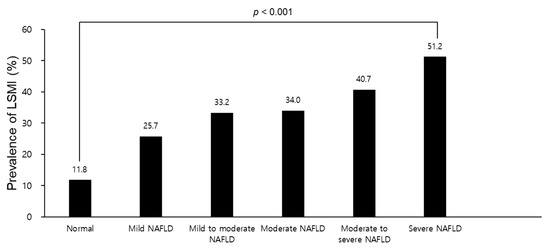 Figure 1 presents prevalence of LSMI according to grade of fatty liver examined by abdominal ultrasonography in the GSHC. Compared to normal (11.8%), prevalence of LSMI gradually increased with increasing fatty liver grade (p < 0.001).