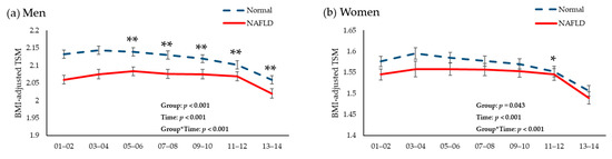 Changes in total skeletal muscle mass/body mass index during the 12-year follow-up period according to the presence of non-alcoholic fatty liver disease in (a) men and (b) women. Abbreviations: NALFD, non-alcoholic fatty liver disease; BMI, body mass index; TSM, total skeletal muscle mass index; CVD, cardiovascular disease. p was calculated after adjusting for age, sex, abdominal obesity, physical activity, smoking status, current drinking status, basal energy expenditure, daily protein intake, mean blood pressure, fasting glucose, total cholesterol, and history of CVD. * p < 0.05. ** p < 0.001.