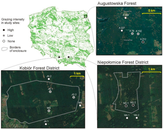 For each of the studied sites, a grazing level of either none (0: no grazing), low (1: weak grazing activity at Augustowska forest complex, grazed sites in “Jankowice” enclosure) or high (2: intensive grazing activity at Augustowska forest complex, grazed sites in “Niepołomice” enclosure) was defined.