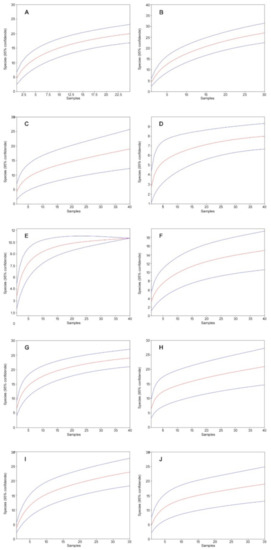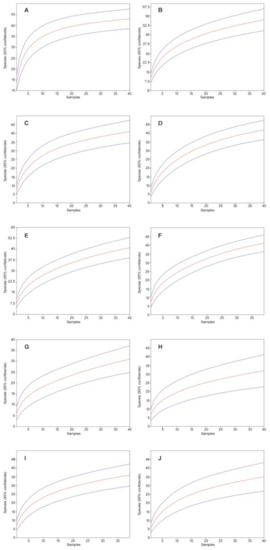 Mao’s tau sample rarefaction curves (red lines) with 95% confidence intervals (blue lines) for the study site in Augustowska forest: (A) A212. 2017, (B) A212, 2019, (C) A78, 2017, (D) A78, 2019, (E) A132, 2017, (F) A132, 2019, (G) A169, 2017, (H) A169, 2019, (I) A227, 2017, (J) A227, 2019 (95% confidence intervals are indicated).