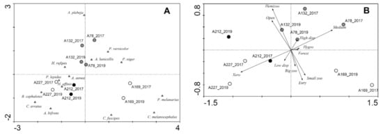 Ordination plots for the study sites (circles; grazing intensity: black—high, grey—low, white—none) and species (triangles) in the Kobiór Forest district and the Niepołomice Forest District: (A) CA based on carabid beetle assemblages, (B) PCA based on the function altraits of carabid beetle assemblages