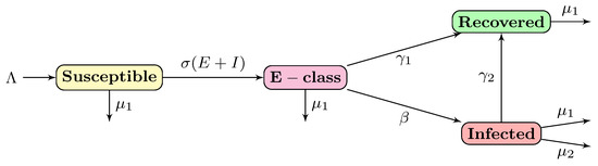 and for total population is Here, are the number of individuals in the susceptible, infectious, and removal compartments, respectively, at time t. is the recruitment number in the S class. The parameter denotes disease transmission rate, is the removal rate, is the natural death, and is the mortality rate due to the infection only. The solution and the detailed analysis of (1) can be found in [28]. It is remarked that the classical SIR model can not explore the scenario of exposed and asymptotic individuals, which is a crucial factor for spreading the disease, especially for SARS-CoV-2 and Influenza type pandemics. Thus, it is essential to consider an advanced model to observe asymptotically exposed class populations’ behavior.