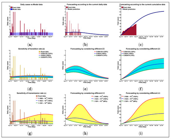 When we increase for 2% to ; , then the peak for the daily new cases moves to 35 on 26 July 2020 (total cases 2900). In addition, when we decrease by 2% to ; , then the peak for the daily new cases moves to 28 September 2020, as three new confirmed cases only (Figure A1h) (total cases 555). Figure A1i connotes the scene for the cumulative data.