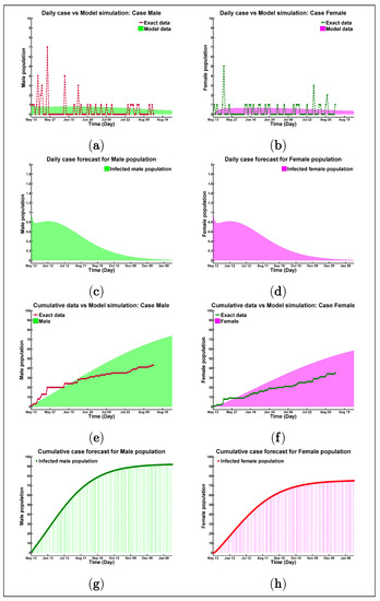 Sex-disaggregated COVID-19 data show equal numbers of cases in both genders; however, there seem to be sex differences in mortality and vulnerability to the disease [36]. Prominent studies suggest that more men than women are dying, potentially due to sex-based immunological [37], or gendered differences, such as patterns and prevalence of smoking [38]. Gender-specific COVID-19 cases are analyzed for the Rohingya refugee camp; for example, Figures (Figure 3a–h) present the real data versus model outcome with the corresponding model forecast. Now, the figures depict the situation for male and female populations in the refugee camp, where Figure 3a,c,e,g present the discrete data versus model solution for males and Figure 3b,d,f,h present the visible scenario for the female population. The average basic reproduction number for the male community is and, for the female community, it is . These figures infer with the total number of the male case 93 (Figure 3g), and the total number of female patients will be 76 (Figure 3h) by the end of January 2021, which confers that the infected female population resembles 44.97% of the total patients in the Rohingya refugee camp in Cox’s Bazar.