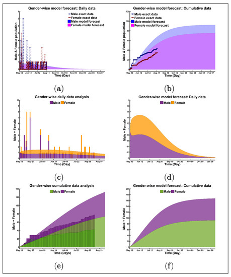 All the figures in Figure 4a–f assist with comparing the infection disparity level between male and female populations. Figure 4a,c,d connote the daily case margin, and Figure 4b,e,f show the cumulative case margin. At a glance, the real statistics of present male-female infection rate and the possible prediction, which was extended based on existing infections, are seen in Figure 4a,b. Figure 4a,b showed how a vulnerable infected male curve is dominating the infected female curve. Within 12 August 2020, the maximum number of male individuals that are infected is 7/day, while, for females, it is 5/day. In early February 2021, predicting the total male and female population will be infected 93 and 76 (93 + 76 = 169), respectively, if we ignore the second wave risk or the other criterion is the same. The same results of Figure 4a,b are displayed in Figure 4c–f using different scaling and patterns. Figure 4e,f display the total infected population by coloring the two different gender infection limits. On the curvature in all diagrams, the lower phase for the male population, whereas the upper surface for the female population without overlapping each other; the limit of gender (female) infection is started from the asymptotic point of gender (male) with time. This analysis shows how the COVID-19 infection can exploit the varying immune and anatomic privilege among the male and female populations in the Rohingya camp, which is very clear through Figure 5.
