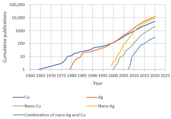 Cumulative numbers of publications on antimicrobial Cu and Ag, as of 1 December 2020. The bibliometric data were searched in the Polytechnique Montréal library Compendex database, as indicated in the Appendix A.