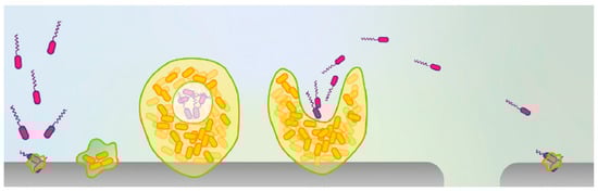 Recently, another model was proposed to explain biofilm formation (Figure 3). This model proposes that multicellular aggregates can form biofilms more easily than single cells []. This model is more likely to correspond to biofilm formation in natural environments, in which the microbes form and disperse biofilms in the pattern of multicellular aggregates, instead of single cells [].