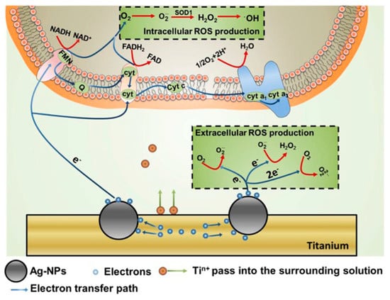 Patients, following surgery, may have to face the serious consequences of nosocomial and postoperative infections, and their associated high health costs []. Microbes, accumulated on implant surfaces, can trigger tissue inflammation, which results in osteolysis, and even bone loss []. Because biofilm-mediated infections on implants occur inside human bodies, they are difficult to detect and treat, so that the best method to resolve this problem is to prevent biofilm formation in the first place. Designing antimicrobial implant surfaces, such as by coating them with NPs, is currently being studied [,]. Implant surfaces, functionalized in this manner, were found to have not only bactericidal properties, but also resistance to bacteria adhesion []. There are various explanations for why nanostructured surfaces are thought to prevent biofilm formation. The sharp edges of nanostructures may destroy microbial membranes, and would also be toxic to human cells []. Theoretically, the hydrophilicities of the substrate and different microbial cell surfaces are related to microbial adhesion []. Surfaces coated with a high density of NPs can limit the adhesion of Gram-positive bacteria, because of the rigid peptidoglycan membrane, which is difficult to flex and adapt to the nanostructured surface []. Roughness is also believed to be related to biofilm formation: surfaces with elevated rugosities favor biofilm formation []. Apart from surface structure-based antimicrobial activity, NPs also have intrinsic antimicrobial mechanisms.