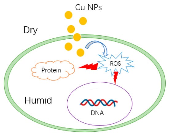 Some research has demonstrated that NPs possess antimicrobial properties under dry conditions [,], indicating that direct contact appears to be a potential antimicrobial mechanism. In a dry environment, no electrochemical reactions occur on the surface of NPs, so ions and electrons are not released to interact with biomolecules, or induce ROS bursts. It is posited that Cu NPs interact with membrane proteins [], and penetrate into bacterial cells [], inducing an explosion of ROS in the intracellular environment (Figure 6) []. Experiments have shown that the production of ions cannot increase the antibacterial effect of Cu NPs [].
