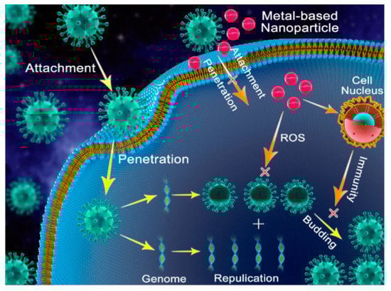 One possible NP antiviral mechanism was proposed as occurring in three stages (Figure 8): (1) interaction with the viral protein shell, to restrain its attachment to human cells; (2) production of ions and ROS, which destroy the viral protein shell, and DNA or RNA; (3) NP penetration into the cell, followed by interaction with enzymes, to prevent viral replication and subsequent spread [,].