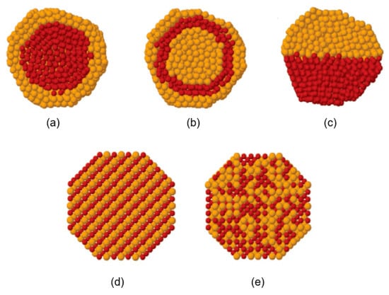- Tchaplyguine, M.; Andersson, T.; Zhang, C.; Björneholm, O. Core-shell structure disclosed in self-assembled Cu-Ag nanoalloy particles. J. Chem. Phys. 2013, 138, 104303. [Google Scholar] [CrossRef] [PubMed]