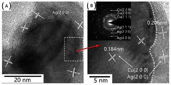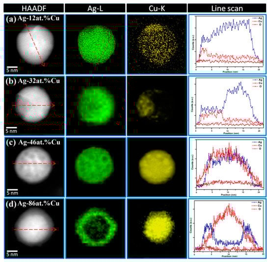 - Kim, N.R.; Shin, K.; Jung, I.; Shim, M.; Lee, H.M. Ag–Cu bimetallic nanoparticles with enhanced resistance to oxidation: A combined experimental and theoretical study. J. Phys. Chem. C 2014, 118, 26324–26331. [Google Scholar] [CrossRef]