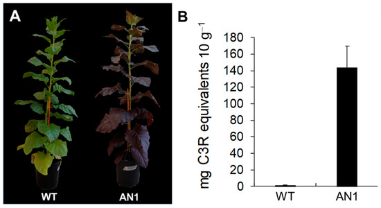 StAN1 overexpression induces anthocyanin accumulation in tobacco plants. (A) Phenotype of a representative plant for wild-type (WT) and plants carrying p35S:StAN1 (AN1) at the end of the growth cycle; (B) Anthocyanin leaf content expressed as C3R equivalents.