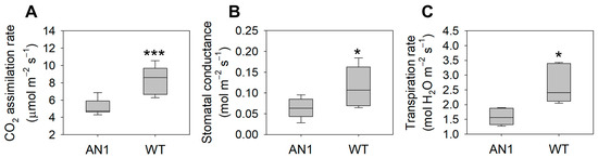 Leaf gas exchanges in AN1 and WT plants. (A) CO2 assimilation rate; (B) Stomatal conductance; (C) Transpiration rate. Asterisks indicate significant differences according to ANOVA (* p < 0.05; *** p < 0.001).