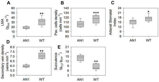 Leaf anatomical and morphological traits in AN1 and WT. (A) Leaf mass per area; (B) Pavement cells density; (C) Adaxial stomatal index; (D) Secondary vein density; (E) Succulence. Asterisks indicate significant differences according to ANOVA (* p < 0.05; ** p < 0.01; *** p < 0.001).