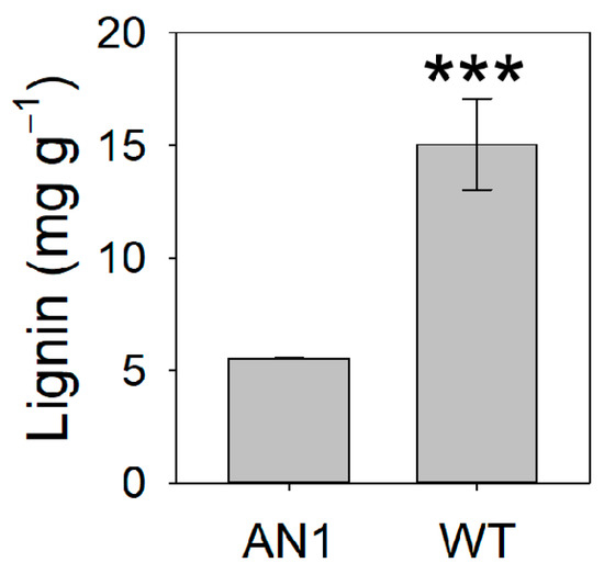 Lignin leaf content in AN1 and WT plants. Asterisks indicate significant differences according to ANOVA (*** p < 0.001).