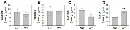 Leaf carbohydrates content in AN1 and WT plants. (A) Glucose; (B) Fructose; (C) Sucrose; (D) Starch. Asterisks indicate significant differences according to ANOVA (* p < 0.05; ** p < 0.01).