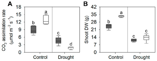 Response of AN1 (grey boxes) and WT plants (white boxes) grown under control and drought condition. (A) CO2 assimilation rate; (B) Shoot dry weight. Tukey post-hoc test was performed on significative differences according to two-way ANOVA (p < 0.05). Different letters indicate significant differences.