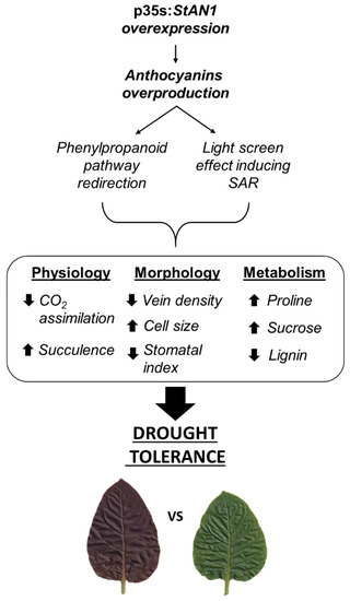 Schematic representation of the possible consequences of anthocyanin accumulation in tobacco leaves. The overexpression of StAN1 induces anthocyanin overproduction, which leads to a redirection of the phenylpropanoid pathway and/or a light screening effect mediated by anthocyanins. These events cause a full reshape of plant physiological, morphological and metabolic parameters, making StAN1 overexpressing plants more tolerant to drought stress.