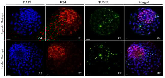 - Neuber, E.; Luetjens, C.M.; Chan, A.W.S.; Schatten, G.P. Analysis of DNA fragmentation of in vitro cultured bovine blastocysts using TUNEL. Theriogenology 2002, 57, 2193–2202. [Google Scholar] [CrossRef]