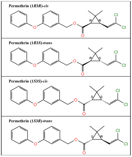 Further, studies in laboratory animals have also suggested antiandrogenic effects, such as reduced sperm motility and sperm count, decreased testes weight, reduced levels of testosterone, structural abnormalities in testes and decreased libido [22,24,56,57,58,59]. Of particular interest and relevance to the current research are various studies that have reported the stereoselective effects of permethrin [28,60]. In this regard, the stereoselective estrogenic activity of permethrin was reported to be due to stereoselectivity in the biotransformation of permethrin into metabolites with more estrogenic activity [28]. A study in rats given oral doses of mixtures of cis-permethrin and trans-permethrin reported higher levels of cis-permethrin than trans-permethrin in all organs [61], suggesting differences in absorption and cellular uptake among the permethrin stereoisomers. Moreover, permethrin was reported to show stereoselectivity in esterase and oxidase metabolism in human liver microsomes [62]. A study on rat adrenal pheochromocytoma (PC12) cells showed the stereoselective induction of oxidative stress and cytotoxicity by permethrin [60]. In addition, in embryo-larval zebrafish, significant differences were observed among the stereoisomers in inducing estrogen-responsive gene expression [63].