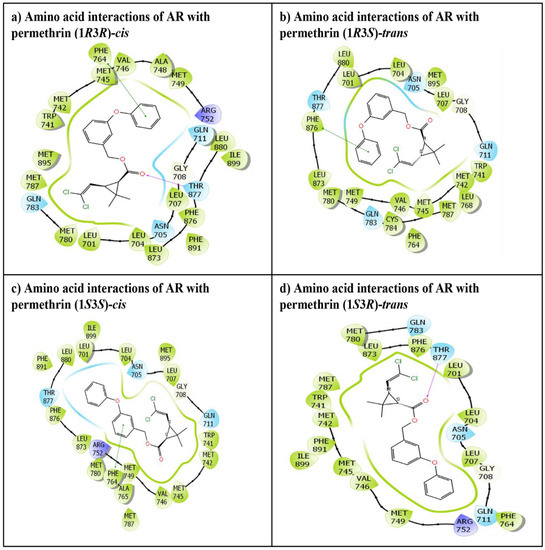 The amino acid residue interactions of the four stereoisomers of permethrin in the ligand binding pocket of the AR: (a) permethrin (1R3R)-cis, (b) permethrin (1R3S)-trans, (c) permethrin (1S3S)-cis, and (d) permethrin (1S3R)-trans. The cyan colored amino acids lining the ligand binding pocket represent polar residues. The green colored amino acid residues represent hydrophobic residues, and the purple colored amino acids represent positively charged residues. The red colored arrows indicate hydrogen bonding interactions, and the green colored lines indicate pi–pi interaction between the ligand and receptor amino acid residues.