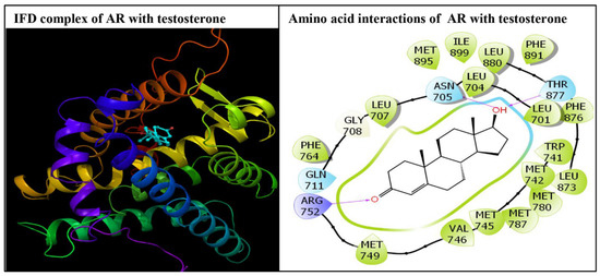The docking display of the androgen receptor (AR) in complex with the native ligand, testosterone (left panel), and the molecular interactions of testosterone with residues lining the AR ligand binding pocket (right panel). The cyan colored amino acids lining the ligand binding pocket represent polar residues. The green colored amino acid residues represent hydrophobic residues, and the purple colored amino acid represents positively charged residues. The red colored arrows indicate hydrogen bonding interactions between the ligand and receptor amino acid residues.