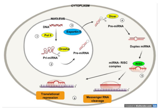 The expression of micro RNAs (miRNAs) is a complex biological process. RNA polymerase II is responsible for the transcription of a precursor RNA, several thousand nucleotides long and with a loop (hairpin) shape, known as “primary miRNA” (pri-miRNA) (1). The nuclear endonuclease Drosha processes the pri-miRNAs by cleaving the distal portion and making shorter chains (70–100 nucleotides) (2). This yields the pre-miRNA, which is transported into the cytoplasm via the nuclear receptor exportin-5 (3). Once in the cytoplasm, the Dicer enzyme processes the pre-miRNA to obtain a short (19–25 nucleotides) double chain RNA sequence (4). Subsequently, one of the two chains is rapidly degraded, while the remainder represents the mature miRNA. Once processed, mature miRNAs can interact with Ago2, an enzyme of the Argonaute family of endonucleases, to form so-called RNA-induced silencing complexes (RISCs) (5). This allows the interaction between the mature miRNA and the target mRNA (6). The miRNA can then perform its function (degradation or translational repression).