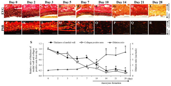 Time-dependent changes of thickness of medial wall and collagen positive area. (A–I) Representative images of the Elastica van Gieson (EVG) staining (scale bar = 50 µm). (J–R) Representative images of the picrosirius red (PSR) staining (scale bar = 50 µm). (S) Quantification of the relative ratio from day 0 of thickness of medial wall, collagen positive area and dilation ratio in the vascular wall. Data are expressed as the mean ± SEM. * P < 0.05 versus day 0. Day 0 (n = 7), day 2 (n = 6), day 3 (n = 5), day 5 (n = 6), day 7 (n = 6), day 10 (n = 5), day 14 (n = 6), day 21 (n = 14), and day 28 (n = 7).