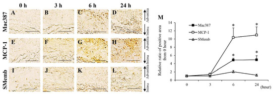 Time-dependent changes of mac387+ macrophage, monocyte chemoattractant protein-1 (MCP-1) and synthetic vascular smooth muscle (SMemb) from 0 to 24 h. (A–D) Representative images of the immunostaining for mac387 (scale bar = 50 µm). (E–H) Representative images of the immunostaining for MCP-1 (scale bar = 50 µm). (J–L) Representative images of the immunostaining for SMemb (scale bar = 50 µm). (M) Quantification of the relative ratio from 0 h of the areas positive for mac387, MCP-1, and SMemb in the vascular wall. Data are expressed as the mean ± SEM. * P < 0.05 versus 0 h. Mac387: 0 h (n = 5), 3 h (n = 6), 6 h (n = 5), and 24 h (n = 5), MCP-1: 0 h (n = 6), 3 h (n = 5), 6 h (n = 6), and 24 h (n = 6), and SMemb: 0 h (n = 6), 3 h (n = 6), 6 h (n = 6), and 24 h (n = 6).