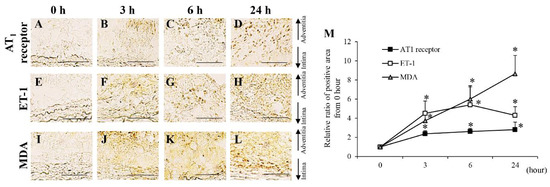 Time-dependent changes of angiotensin II type 1 (AT1) receptor, endothelin-1 (ET-1) and malondialdehyde (MDA) from 0 to 24 h. (A–D) Representative images of the immunostaining for AT1 receptor (scale bar = 50 µm). (E–H) Representative images of the immunostaining for ET-1 (scale bar = 50 µm). (J–L) Representative images of the immunostaining for MDA (scale bar = 50 µm). (M) Quantification of the relative ratio from 0 h of the areas positive for AT1 receptor, ET-1, and MDA in the vascular wall. Data are expressed as the mean ± SEM. * P < 0.05 versus 0 h. AT1 receptor: 0 h (n = 6), 3 h (n = 6), 6 h (n = 5), and 24 h (n = 7), ET-1: 0 h (n = 6), 3 h (n = 7), 6 h (n = 5), and 24 h (n = 7), and MDA: 0 h (n = 6), 3 h (n = 6), 6 h (n = 6), and 24 h (n = 7).