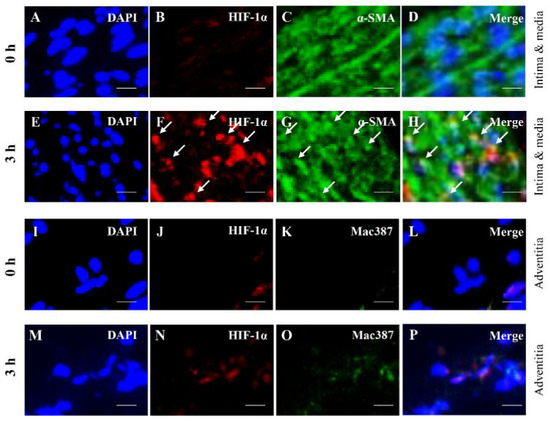 Localization of hypoxia inducible factor (HIF)-1α, α-smooth muscle actin (α-SMA) + cells and mac387+ macrophages in the aortic wall. Double-immunostaining for HIF-1α and α-SMA in 0 h (A–D) and 3 h (E–H). The white arrows indicate the co-localized region. Double-immunostaining for HIF-1α and mac387+ macrophages in 0 h (I–L) and 6 h (M–P). Scale bar = 15 µm. 0 h (n = 5), 3 h (n = 5), and 6 h (n = 5).
