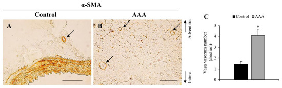 Observation of adventitial vasa vasorum (VV). Representative images of immunostaining for α-smooth muscle actin in (A) control wall (scale bar = 100 μm). (B) AAA wall (scale bar = 200 μm). (C) VV number (/section) in the aortic wall. *P < 0.05 versus control wall. Control wall (n = 12) and AAA wall (n = 17).