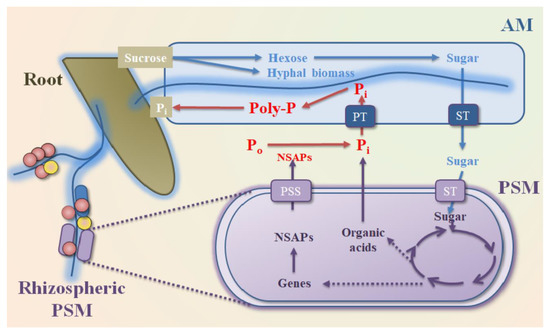 A schematic diagram of possible phosphorus (P) and sugar transport in roots, arbuscular mycorrhizal (AM), and phosphate solubilizing microorganisms (PSM) [151,152]. Arrows of different color indicate the possible reaction locations of roots (brown), AM (blue), and PSM (purple). Letters of different color indicate the possible sugar reactions (blue), P cycle (red), and microbial metabolism of PSM (purple), respectively. Pi for inorganic P, Po for organic P, ST for sugar transporter, PSS for protein secretory system, and NSAPs for non-specific acid phosphatases.