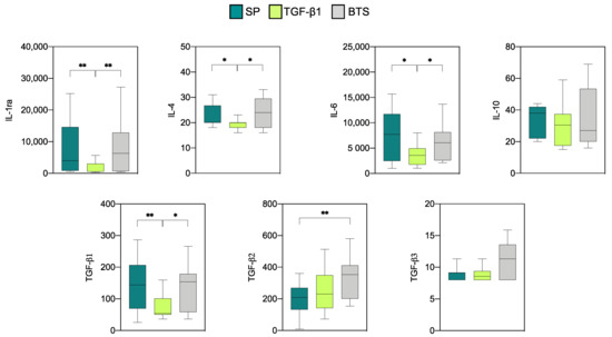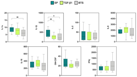 Levels of proinflammatory cytokines (pg/mL) on day 6 of the cycle in endometrial explants of “recipient” sows infused with 40 mL of SP, TGF-β1 in BTS extender (TGF-β1), or extender alone (BTS) 30 min prior to insemination. These sows were not inseminated. The box plots show the median (line) and the interquartile ranges (boxes, Q1–Q3). * p < 0.05, ** p < 0.01.