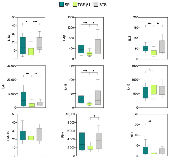 Levels of proinflammatory cytokines (pg/mL) on day 6 of pregnancy in endometrial explants of “donor” sows infused with 40 mL of SP, TGF-β1 in BTS extender (TGF-β1), or BTS alone (control) 30 min prior to insemination. The box plots show the median (line) and the interquartile ranges (boxes, Q1–Q3). * p < 0.05, ** p < 0.01, *** p < 0.001.