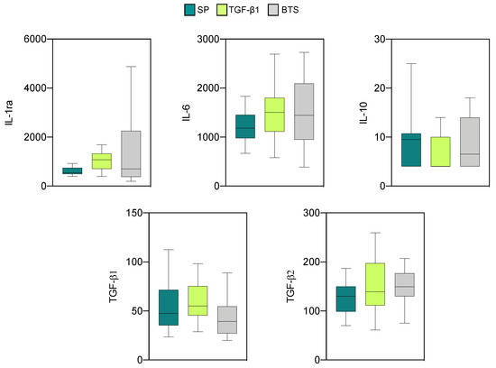 Levels of anti-inflammatory cytokines (pg/mL) on day 6 of the cycle in endometrial explants of “recipient” sows infused with 40 mL of SP, TGF-β1 in BTS extender (TGF-β1), or extender alone (BTS). These sows were not inseminated. The box plots show the median (line) and the interquartile ranges (boxes, Q1–Q3).