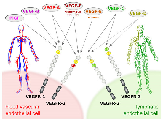 In vertebrates, the family of vascular endothelial growth factors (VEGFs) typically comprises five genes: VEGF-A (in older literature often referred to simply as “VEGF”), placenta growth factor (PlGF), VEGF-B, VEGF-C, and VEGF-D. In addition to these orthodox VEGFs, several genes coding for VEGF-like molecules have been discovered in some members of the poxvirus and iridovirus families (collectively named VEGF-E) [1,2,3,4] and in venomous reptiles (collectively named VEGF-F) [5]. In vertebrates, the VEGF growth factors are central to the development and maintenance of the cardiovascular system and the lymphatic system. Non-vertebrates also feature VEGF-like molecules, but their functions are less well defined.