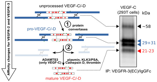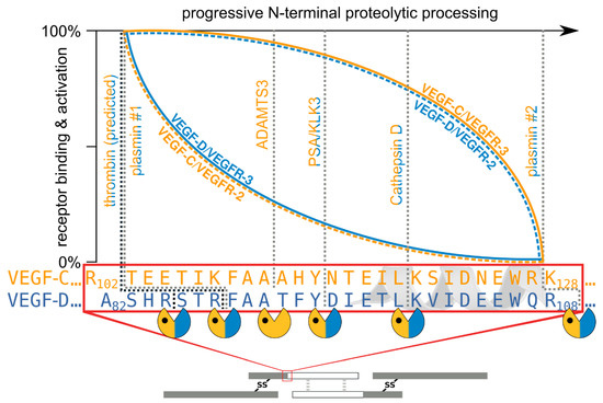 When comparing the effects of different VEGF-C- and VEGF-D-activating proteases [45], two trends are visible, which are summarized in Figure 5: