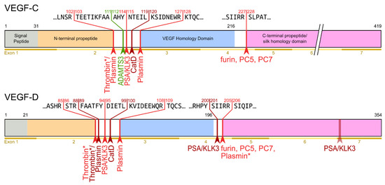- The second, extracellular cleavage activates the protein. This cleavage occurs between the N-terminal propeptide and the VHD [38] and can be mediated by different proteases. ADAMTS3 mediates VEGF-C activation in the embryonic development of the mammalian lymphatic system [41,42,43]. ADAMTS3 is specific for VEGF-C and does not activate VEGF-D. All other activating proteases target both VEGF-C and VEGF-D: plasmin [43,44], prostate-specific antigen (KLK3/PSA), cathepsin D (CatD) [45], and thrombin [46]. The resulting forms of VEGF-C and VEGF-D are referred to as active, mature, or short forms. However, they differ from each other at their N-termini because different proteases cleave at different positions within the linker between the N-terminal propeptide and the VHD (see Figure 4).