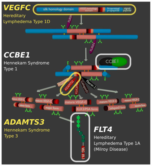 All mutations that disrupt the VEGF-C/VEGFR-3 signaling pathway result in hereditary lymphedema (Figure 6). While the most common type of hereditary lymphedema is caused by a mutation in the VEGF-C receptor [134,135], any signaling pathway components can be affected, including the proteolytic activation of VEGF-C. Thus, in human lymphedema patients, disease-causing mutations have been found in VEGF-C itself [136,137], in its activating protease ADAMTS3 [62,63], and the cofactor CCBE1 [57,138]. Genetic lesions in FAT4 result in a phenotype closely resembling the phenotypes caused by mutations in CCBE1 or ADAMTS3. Only recently, Hennekam Syndrome was split into three different subtypes depending on the underlying genetic lesion (Hennekam Syndrome Type 1, 2, and 3).