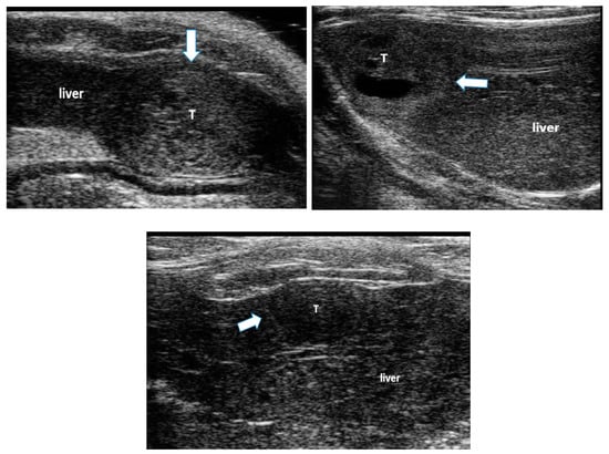 Examples of hepatocellular carcinoma (HCC) tumors developed in the liver of rats following ingestion of diethylnitroseamine (DEN) for 12 weeks. The white arrows point to HCC tumors (T) surrounded by liver tissue. Liver tissue is hyper-echoic and coarse due to the cirrhotic changes.
