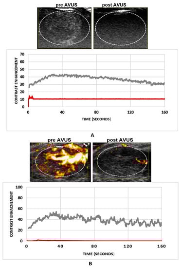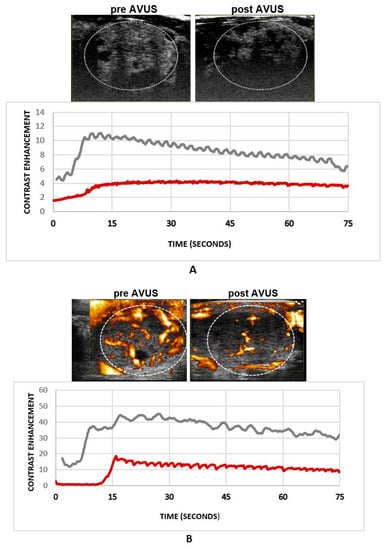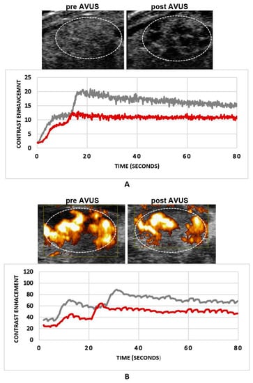 Contrast-enhanced ultrasound (CEUS) imaging was performed to assess tumor perfusion before and after AVUS treatment using nonlinear contrast (NLC) and power Doppler (PD) modes. This involved continuous serial imaging at 10 fps during the contrast enhancement of the tumor. Imaging presets and time compensation gain were optimized and kept fixed for pre- and post-therapy imaging. An intravenous bolus injection of 0.05 mL microbubbles was used for each imaging session.